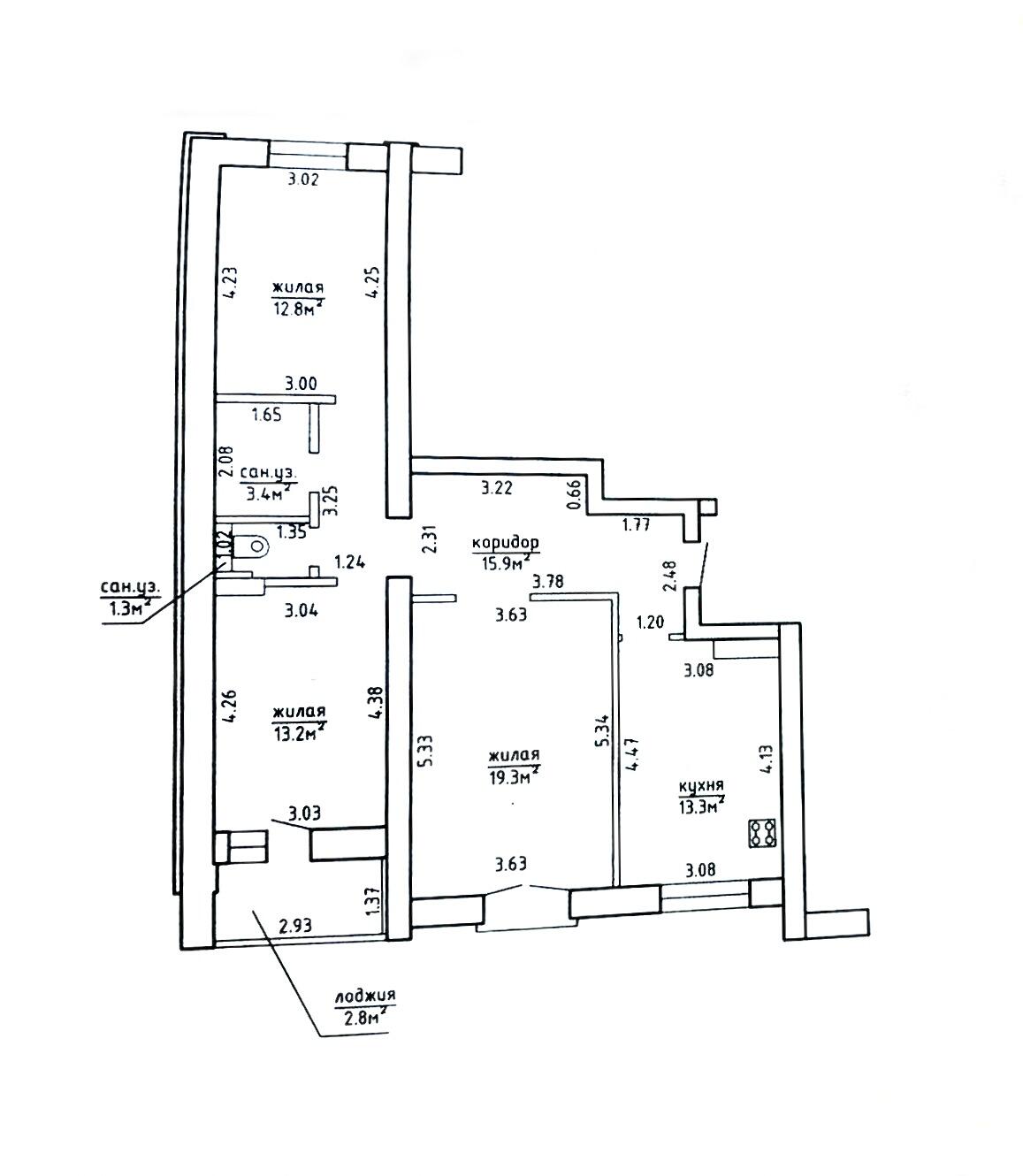 Площадь общ/жил/кух 82 / 44.28 / 13.3 кв.м.
