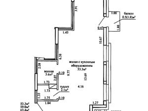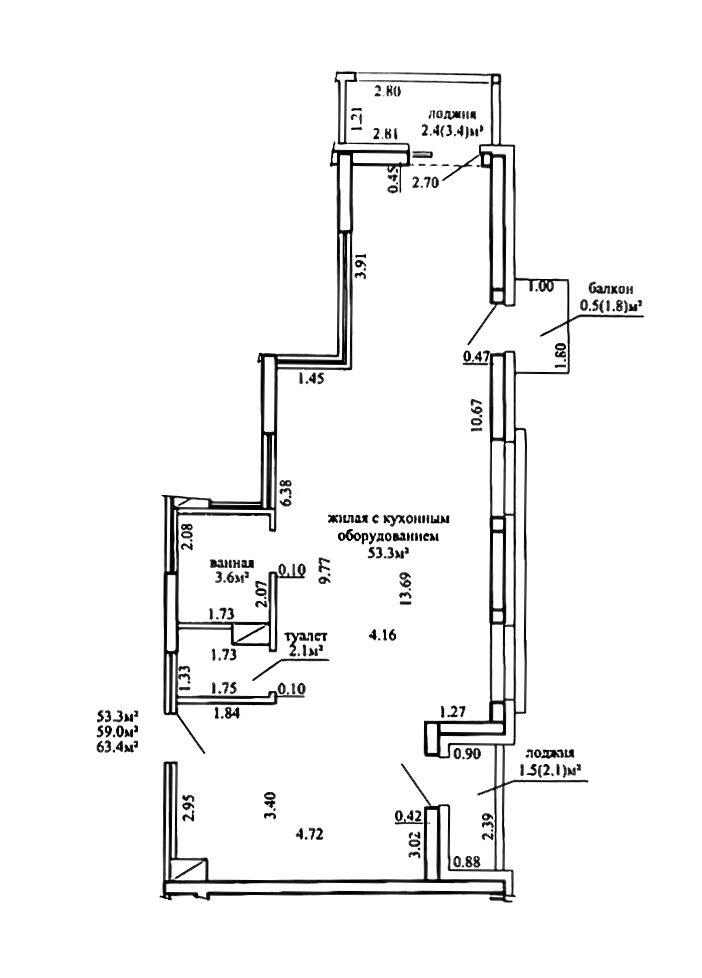 Площадь общ/жил/кух 63.4 / 53 / - кв.м.