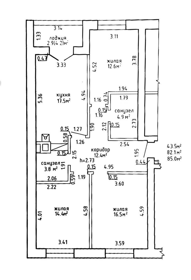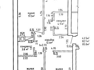 Площадь общ/жил/кух 85 / 43.5 / 17.5 кв.м.