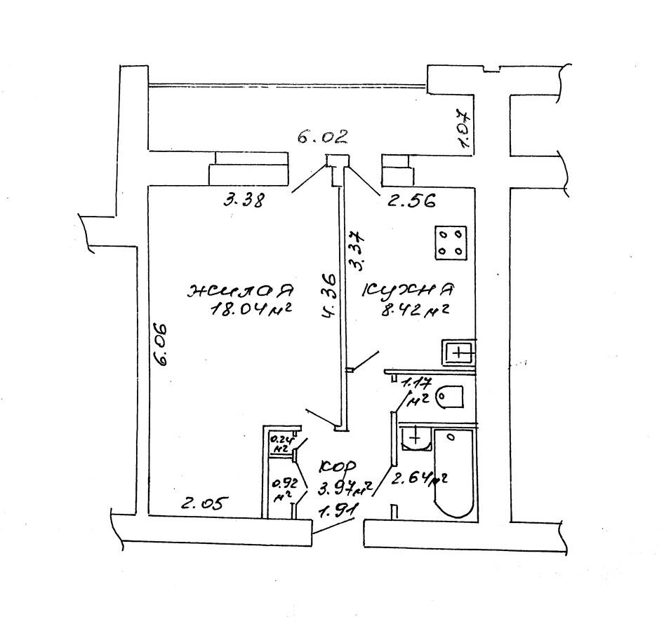 Площадь общ/жил/кух 38 / 18 / 8.4 кв.м.